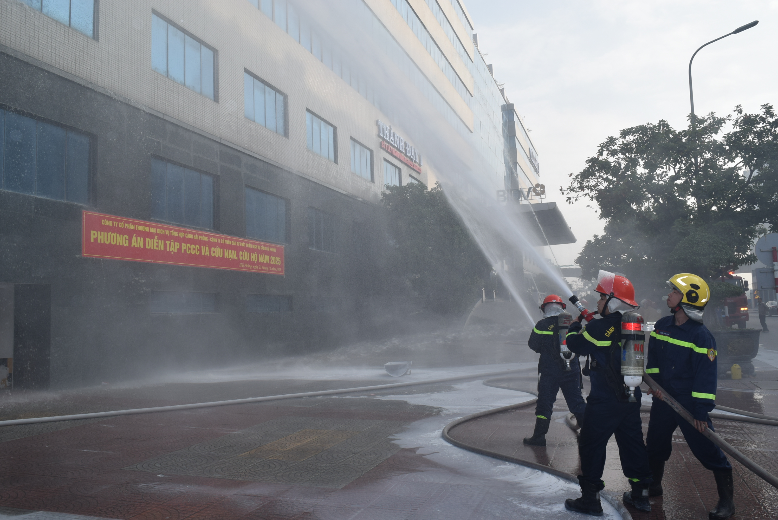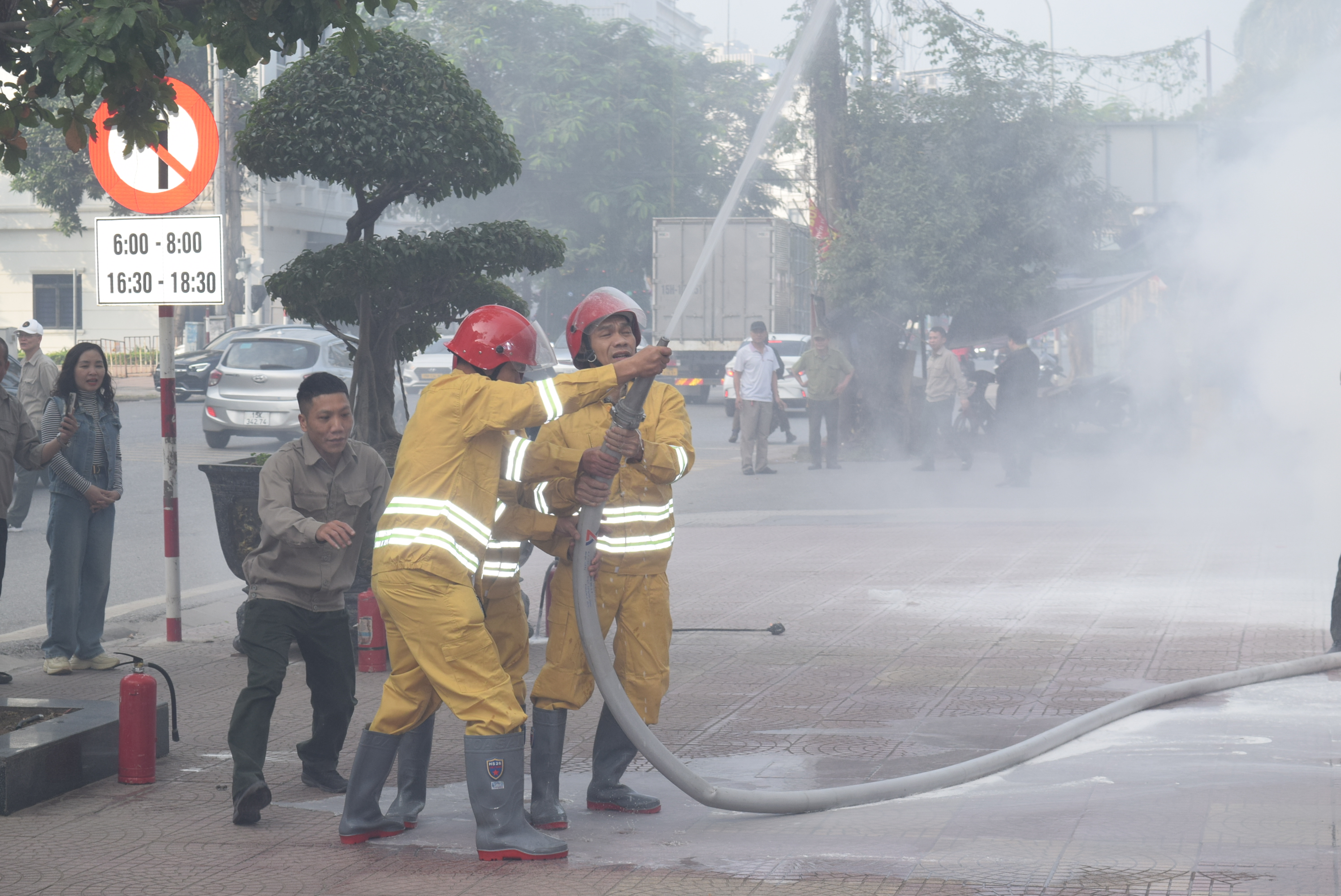 Song song đó, Đội Chữa cháy và CNCH khu vực 1 (Phòng Cảnh sát PCCC và CNCH) cũng đã điều 02 xe chữa cháy chuyên dụng cùng các chiến sĩ cảnh sát PCCC phối hợp với lực lượng chữa cháy ở cơ sở triển khai đội hình, nhanh chóng dùng vòi phun nước. Sau gần 30 phút đám cháy giả định đã được khống chế và dập tắt hoàn toàn, toàn bộ người bị nạn đã được giải cứu.
